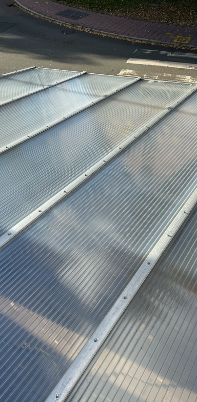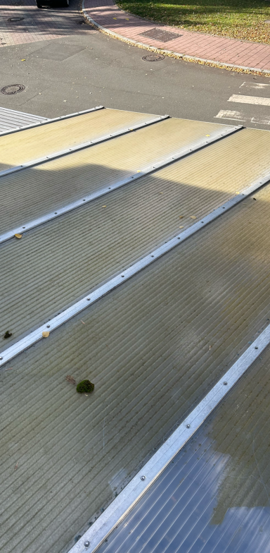 Unser Kunde war überzeugt, dass sein Polycarbonat-Dach nicht mehr richtig sauber wird. Die Verschmutzungen waren über Jahre hinweg eingebrannt und mit normalen Mitteln kaum lösbar.